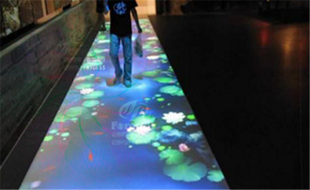地面互動投影系統(tǒng)采用懸掛在頂部的投影設備把影像效果投射到地面,當人走至投影區(qū)域時,通過系統(tǒng)識別,他們可以直接使用雙腳或動作與投影幕上的虛擬場景進行交互,各種互動效果就會隨著人的腳步產(chǎn)生相應的變幻。